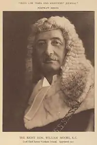 Sir William Moore, 1st Baronet, PC (NI), DL (22 November 1864 – 28 November 1944) was a Unionist member of the British House of Commons from Ireland and a Judge of Ireland, and subsequently of Northern Ireland. He was created a Baronet (of Moore Lodge, Ballymoney, County Antrim, Northern Ireland) in 1932.