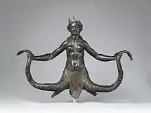 This Roman bronze sculpture ca. 1571–1590 depicts a siren from Greek mythology, believed to be an emblem of the Colonna family, and first recorded in the collection of the Cardinal Francesco Maria del Monte before passing into the Barberini family.[1][2] A female figure, nude from the waist up, boasts a crown and a multi-tentacled mermadic lower body. With her chin up and her arms outstretched, she grasps a scaly tentacle with each hand.