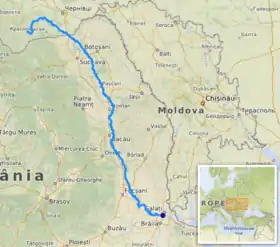 The Siret or Sireth (Ukrainian: Сірет or Серет, Romanian: Siret pronounced [siˈret], Hungarian: Szeret, Russian: Сирет) is a river that rises from the Carpathians in the Northern Bukovina region of Ukraine, and flows southward into Romania before it joins the Danube.[1][2] It is 647 km (402 mi) long,[3]:9 of which 559 km (347 mi) in Romania,[2][3]:9[4] and its basin area is 44,811 km2 (17,302 sq mi),[3]:6 of which 42,890 km2 (16,560 sq mi) in Romania.[2][3]:6[4] Its average discharge is 250 m3/s (8,800 cu ft/s).[3]:15 In ancient times, it was named Hierasus (Ancient Greek Ιερασός).