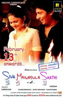 Siva Manasula Sakthi (transl. Sakthi in Siva's heart) also known by the initialism SMS,[1] is a 2009 Indian Tamil-language romantic comedy film written and directed by debutant M. Rajesh, a former assistant of director S. A. Chandrasekhar. It stars Jiiva and newcomer Anuya Bhagwat, a student of Film and Television Institute of India, with Santhanam, Urvashi and Sathyan appearing in supporting and Arya appearing in a cameo role. The film was later remade in Telugu as Siva Manasulo Sruthi and released in 2012.