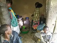 Almost every settlement in Tigray holds one or more Inda Siwa, which serve as local bars and which generate off-farm income.[8] Low seats are foreseen around the walls of the room; people drink in group and chat while sipping their siwa. Commonly after some drinks tongues gets loose. If a newcomer joins the group of customers, all will politely welcome him, and invite him to sit with them. The owner of the business, mostly a woman, tallies the number of consumptions per customer, and may get help from the customers to do her accounting. Frequently, adolescent boys or girls drop in to sell kollo (roasted grains) or buqulti (germinated beans)[9] seasoned with senafiche (home-made mustard). The consumption of these snacks will stimulate the customer to order additional siwa. Smaller inda siwa open only on fixed days of a week, but in any case, all inda siwa will be open on (the eve of) market days.