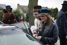 The police officer is another indication of the syncretic way of selecting procession characters: this character resembles the leader of similar żandary parades from Poznań.[8] The police officer leads the procession, marches in the front and chooses the route. Police officers stop cars passing by to give the drivers "holiday fines" and knock on the doors of nearby houses so the hosts admit the procession and offer the participants some refreshments. The police officer collects donations offered by passers-by, drivers or other people. The person playing this role must be sociable and able to integrate the group and make people laugh.