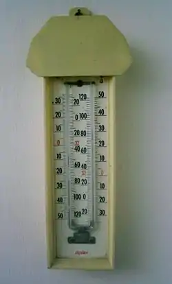 Six's maximum and minimum thermometer is a registering thermometer that can record the maximum and minimum temperatures reached over a period of time, for example 24 hours. It is used to record the extremes of temperature at a location, for instance in meteorology and horticulture. It was invented by the British scientist James Six, in 1780;[1] the same basic design remains in use.