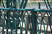 The bridge is 536 feet (163 m) in length, consisting of four parallel cord through Pratt trusses made of wrought iron.[2] The roadway is narrow at 19 feet (5.8 m) wide with two lanes.[2][5] Along each side is a 6-foot wide (1.8 m) sidewalk with ornamental railings. The piers and abutments are masonry and built of local Grand River limestone. The Sixth Street Bridge is the longest and oldest metal truss bridge in Michigan.[2]