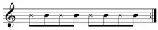 4 time (𝄆1 & 2 & 3 & 4 & 𝄇), the chosen guitar chord is played on the downbeat (indicated by numbers), and then a ghost note is played on the upbeat (indicated by ampersands) by lifting the left hand off the fret a few millimeters.[5] However, most traditional ska is focused on the upbeat; playing on the downbeat is more closely associated with reggae, where the ska strokes are played much more slowly as opposed to ska.