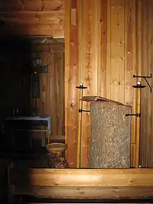 The contents of the church were sold at an auction but many objects were saved by the parishioners, who eventually began to work for a reconstruction of the church. In 1955, the Skaga foundation was formed and in the midsummer of 1960 a reconstructed church was inaugurated on the same spot. The new church had been designed based on old drawings, notes and preserved objects from the old church. Just as in the original church, a bear's hide constituted the mat, the pulpit was carved from a single large log, and a silver bleak hung above the pulpit. Finally, the locals had succeeded in fulfilling their dream of recreating their old stave church.[7]