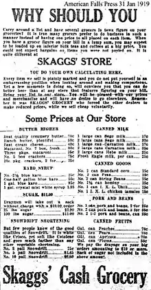 - 1915 In April, S. M. opens the Skaggs Cash Store "with his own hands, on rented property, on borrowed money."[4] The store was about 18x32 feet. It was located in the original town of American Falls, adjacent to the Union Pacific railroad tracks, and he apparently bought large lots from the rail cars and sold them to the public. That store became Skaggs Store No. 1 and is now beneath the American Falls Reservoir.[5] When the town was relocated between 1923 and 1925, that store was situated at the corner of Ft. Hall and Idaho Street, now housing the Senior Center.[6] Unusual for the time, the Rev. Skaggs had a cash only, no credit policy, which all his sons later adopted.[lower-alpha 2][lower-alpha 3] (See adjacent newspaper ads.)