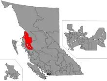 As of the 2020 provincial election, Skeena comprises the southern portion of the Regional District of Kitimat-Stikine, with the exception of the southern tip of the region which is part of the North Coast electoral district. It is located in western British Columbia, with the northwest bordering Alaska, United States. Communities in the electoral district consist of Terrace and Kitimat.[1]