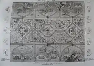 The painted timber ceiling is signed and dated 1638 by J. Stalker and is in vernacular contrast, albeit the designs are derived from the work of a goldsmith at the French royal court, Etienne Delaune.[3] Lively scenes illustrate the seasons as well as the Montgomerie and Douglas conjoined coat of arms, oddly with the quarters of the Montgomerie arms incorrectly placed as in the Polnoon example. The arms in the panel above the entrance door also have this 'mirror image' arrangement.[4]