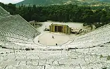 In the theatre of ancient Greece, the skene was the structure at the back of a stage. The word skene means 'tent' or 'hut', and it is thought that the original structure for these purposes was a tent or light building of wood and was a temporary structure.[1] It was initially a very light structure or just cloth hanging from a rope, but over the course of time the skene underwent fundamental changes. First, it became a permanent building, whose roof could sometimes be used to make speeches, and as time passed it was raised up from the level of the orchestra, creating a proskenion, or "space in front of the skene". The facade of the proskenion was behind the orchestra and provided a space for supporting stage scenery.