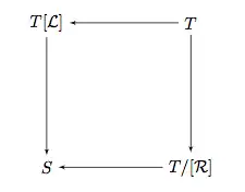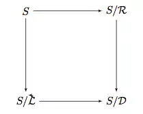 A skew lattice S is symmetric if for any , if . Occurrences of commutation are thus unambiguous for such skew lattices, with subsets of pairwise commuting elements generating commutative subalgebras, i.e., sublattices. (This is not true for skew lattices in general.) Equational bases for this subvariety, first given by Spinks[11] are: and . A lattice section of a skew lattice is a sublattice of meeting each -class of at a single element. is thus an internal copy of the lattice with the composition being an isomorphism. All symmetric skew lattices for which |S/D| \leq \aleph_0, admit a lattice section.[10] Symmetric or not, having a lattice section guarantees that also has internal copies of and given respectively by and , where and are the and congruence classes of in . Thus and are isomorphisms.[8] This leads to a commuting diagram of embedding dualizing the preceding Kimura diagram.
