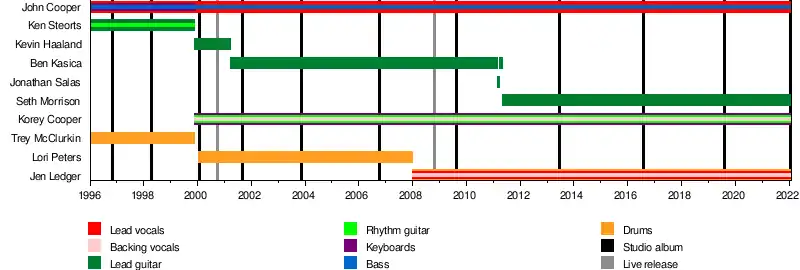 ![]() Press photo of Skillet, 2019. From left to right: Jen Ledger, John Cooper, Korey Cooper and Seth Morrison. | |