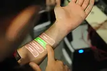 Skinput is an input technology that uses bio-acoustic sensing to localize finger taps on the skin. When augmented with a pico-projector, the device can provide a direct manipulation, graphical user interface on the body. The technology was developed by Chris Harrison, Desney Tan, and Dan Morris, at Microsoft Research's Computational User Experiences Group.[1] Skinput represents one way to decouple input from electronic devices with the aim of allowing devices to become smaller without simultaneously shrinking the surface area on which input can be performed. While other systems, like SixthSense have attempted this with computer vision, Skinput employs acoustics, which take advantage of the human body's natural sound conductive properties (e.g., bone conduction).[2] This allows the body to be annexed as an input surface without the need for the skin to be invasively instrumented with sensors, tracking markers, or other items.