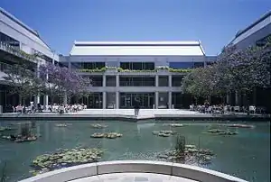 The Skirball Cultural Center is an educational institution in Los Angeles, California devoted to sustaining Jewish heritage and American democratic ideals. It has been open to the public since 1996. The center, named after philanthropist-couple Jack H. Skirball and Audrey Skirball-Kenis, features a museum with regularly changing exhibitions, film events, music and theater performances, comedy, family, literary and cultural programs. The campus includes a museum, a performing arts center, conference halls, classrooms, libraries, courtyards, gardens, and a café.