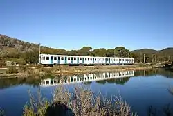 Construction commenced in October 1984, with tunnelling beginning in June 1985.[3] The 3.3 km Bilson Tunnel was constructed using a 5.5-metre (18 ft) tunnel boring machine, while the 2.6 kilometre Blue Cow tunnel was constructed using the traditional "drill and blast" method.[4] A consortium of Swiss and Australian companies (SLM, BBC, and Comeng[5]) provided the rolling stock, overhead wiring, sub-stations, communications and signalling. The 5.9 kilometre line opened from Bullocks Flat to Perisher on 26 July 1987 with the entire line opened through to Blue Cow on 31 March 1988.[6][7][8]