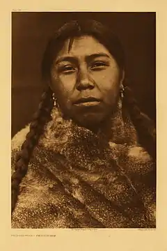 The name "Skokomish" comes from the Twana sqʷuqʷóbəš, also spelled sqWuqWu'b3sH, and meaning "river people" or "people of the river".[1][2][3] The Skokomish were one of the largest of the nine different Twana village communities that existed before about 1860. By their locations, the nine groups were the Dabop, Quilcene ("salt-water people"), Dosewallips, Duckabush, Hoodsport, Skokomish (Skoko'bsh), Ctqwəlqweli ("Vance Creek"), Tahuya, and Duhlelap (Tule'lalap) communities.[4] Within these nine communities there were at least 33 settlements.[5]
