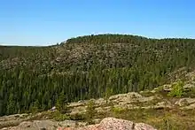 Skuleskogen National Park is in the municipalities of Örnsköldsvik and Kramfors, both of Västernorrland County, both in the historical Swedish province of Ångermanland.[4] It is 27 kilometres (17 mi) south of the city of Örnsköldsvik and 40 kilometres (25 mi) north of the city of Kramfors, the respective capitals of the municipalities mentioned above.[S 1] It covers a surface area of 3,062 hectares (7,570 acres) of which 282 hectares (700 acres) are maritime,[S 2] the park stretching, in fact, along the coast of the Baltic Sea.