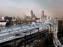 SkyCycle was a proposed transport infrastructure project for London of a 219-kilometre (136 mi) network of elevated cycle paths above train tracks.[1][2] The routes would have had a width of up to 15 metres (49 ft), and be accessed by over 200 ramps throughout the city,[2] subject to a toll of £1.[3] The developers of the project estimated that the cycle paths would accommodate 400,000 riders during rush hour and shave 30 minutes off current travel time.[4] If the project became a reality, its construction was estimated to take over 20 years.[4] The project was the creation of landscape architects Exterior Architecture and Space Syntax, with whom Norman Foster of Foster and Partners had been working since 2012.[5] The proposals were welcomed by Network Rail.[6]