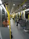The Hyundai Rotem cars are 3 m (9 ft 10+1⁄8 in) in width and 20 m (65 ft 7+3⁄8 in) in length, both wider and longer than the Bombardier Mark I, Mark II and Mark III trains. Each two-car train has seating for 88 and a normal capacity of 334 passengers at four passengers per square metre, with crush load capacity of 400.[36] Therefore a two-car Hyundai Rotem train has more capacity than a four-car Mark I train. The trains feature large, dedicated spaces for wheelchair users, bicycles, and strollers, and sufficient space between seats for luggage. The trains also have large LED displays on both ends of the exterior and interior of the train, displaying the terminus station on exterior signs, with interior displays showing next station, terminus station, and system announcement information.