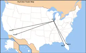 SkyValue, formally known as SkyValue USA, was a seasonal American low-cost airline that was headquartered in Fort Lauderdale, Florida, and for the 2006–07 winter season, its only season of operations, operated from a hub at Gary/Chicago International Airport (GYY) in Gary, Indiana, which lies 25 miles southeast of the Chicago Loop.[1]