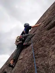 Slab climbing is a type of rock climbing where the rock face is at an angle less steep than vertical.[1] It is characterized by balance- and friction-dependent moves on very small holds.[2] It is often not leadable, or climbable from the ground up, unless it has pre-drilled bolts to protect the climb, making most slab climbs either top rope climbing or sport climbing. Special techniques such as smearing are necessary to climb slab. It is a type of face climbing and is distinctly different from crack climbing. Slab climbing is a relatively new area of climbing, having become more popular in the last 30 years, and some of the highest graded routes are currently being realized.