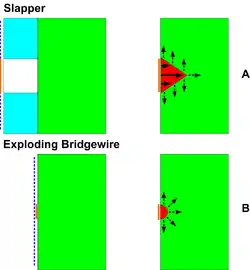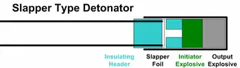 A slapper detonator, also called exploding foil initiator (EFI), is a relatively recent kind of a detonator developed by Lawrence Livermore National Laboratory, US Patent No. 4,788,913. It is an improvement of the earlier exploding-bridgewire detonator; instead of directly coupling the shock wave from the exploding wire, the expanding plasma from an explosion of a metal foil drives another thin plastic or metal foil called a "flyer" or a "slapper" across a gap, and its high-velocity impact on the explosive (for example, PETN or hexanitrostilbene) then delivers the energy and shock needed to initiate a detonation. Normally all the slapper's kinetic energy is supplied only by the heating (and hence expansion) of the plasma (the former foil) by the current passing through it, though constructions with a "back strap" to further drive the plasma forward by magnetic field exist too. This assembly is quite efficient; up to 30% of the electrical energy can be converted to the slapper's kinetic energy.