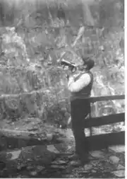 There were several different categories of worker in the quarries. The quarrymen proper, who made up just over 50% of the workforce, worked the slate in partnerships of three, four, six or eight, known as "bargain gangs".[47] A gang of four typically consisted of two "rockmen" who would blast the rock to produce blocks, a splitter, who would split the blocks with hammer and chisel, and a dresser. A rybelwr would usually be a boy learning his trade, who would wander around the galleries offering assistance to the gangs. Sometimes a gang would give him a block of slate to split. Other groups were the "bad rockmen" who usually worked in crews of three, removing unworkable rock from the face, and the "rubbish men" who cleared the waste rock from the galleries and built the tips of waste which surrounded the quarry.[48] One ton of saleable slate could produce up to 30 tons of waste.