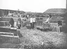 The bad rockmen and rubbish men were usually paid by the ton of material removed, but the quarrymen were paid according to a more complicated system. Part of the payment was determined by the number of slates the gang produced, but this could vary greatly according to the nature of the rock in the section allocated to them. The men would therefore be paid an extra sum of "poundage" per pound's worth of slate produced. "Bargains" were let by the setting steward, who would agree a price for a certain area of rock. If the rock in the bargain allocated to a gang was poor, they would be paid a higher poundage, while good rock meant a lower poundage.[49] The first Monday of every month was "bargain letting day" when these agreements were made between men and management. The men had to pay for their ropes and chains, for tools and for services such as sharpening and repairing. Subs (advances) were paid every week, everything being settled up on the "day of the big pay". If conditions had not been good, the men could end up owing the management money. This system was not finally abolished until after the Second World War.[50]