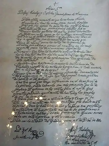 The abolition of slavery was part of the ideology of the insurgents during the war of Mexican independence. Miguel Hidalgo y Costilla directed that this provision was published by José María Anzorena on October 19, 1810, in Morelia, by Ignacio López Rayón in Tlalpujahua on October 24, 1810, by José María Morelos through the Bando del Aguacatillo on November 17, 1810,[9] and by Miguel Hidalgo through a pamphlet published in Guadalajara on November 29, 1810,[10] who also published and ordered to print the Decreto contra la esclavitud, las gabelas y el papel sellado on December 6, 1810, in the same square.[11] When Hidalgo died, the abolition of slavery was ratified by López Rayón in the Constitutional Elements in April 1812 and by José María Morelos in the Sentiments of the Nation in September 1813. Once Mexico gained independence, former insurgents Guadalupe Victoria and Vicente Guerrero ratified the abolition of slavery through presidential decrees, respectively during their terms of office, on September 16, 1825, and September 15, 1829.