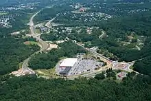 New Scotland Road through Slingerlands was labeled as part of New York State Route 85 in the 1930 renumbering of state highways.[8] In 1968, the Slingerlands Bypass was constructed as a two-lane extension of the Crosstown Connection, a limited-access highway in the city of Albany; Route 85 was then routed onto this highway.[9] The original plan was to connect with the Delmar Bypass near New York State Route 85A, thereby bypassing Slingerlands, it and the Delmar Bypass were never finished due to a lack of funding.[10][11] In 1987, the developer of the Juniper Fields sub-division agreed to build for the town a 1,700 foot extension of the Delmar Bypass to Van Dyke Avenue, and the developer of Delmar Village agreed to build a 2,750 foot extension of Fisher Boulevard to Delaware Avenue, this then left only a 6,000 foot extension of the Delmar Bypass to complete a full loop around Delmar and Slingerlands. At the time it was still the long-term goal of the town to extend both bypasses themselves to their original meeting point near Route 85A.[10] In 2007, the existing Slingerlands Bypass was reconstructed from two to four lanes and the highway was extended behind the Price Chopper Plaza to meet New Scotland Road over Le Grange Road opposite Cherry Avenue Extension. Each intersection, four in all, were converted to two-lane roundabouts.[12]