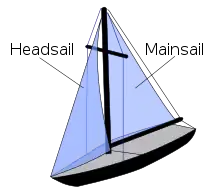 A sloop is a sailboat with a single mast[1] typically having only one headsail in front of the mast and one mainsail aft of (behind) the mast.[note 1] Such an arrangement is called a fore-and-aft rig, and can be rigged as a Bermuda rig with triangular sails fore and aft, or as a gaff-rig with triangular foresail(s) and a gaff rigged mainsail. Sailboats can be classified according to type of rig, and so a sailboat may be a sloop, catboat, cutter, ketch, yawl, or schooner.[2] A sloop usually has only one headsail, although an exception is the Friendship sloop, which is usually gaff-rigged with a bowsprit and multiple headsails.[3] If the vessel has two or more headsails, the term cutter may be used,[4] especially if the mast is stepped further towards the back of the boat.