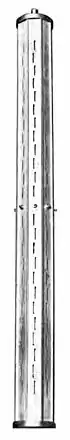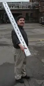 A slot antenna consists of a metal surface, usually a flat plate, with one or more holes or slots cut out.[1] When the plate is driven as an antenna by an applied radio frequency current, the slot radiates electromagnetic waves in a way similar to a dipole antenna. The shape and size of the slot, as well as the driving frequency, determine the radiation pattern. Slot antennas are usually used at UHF and microwave frequencies at which wavelengths are small enough that the plate and slot are conveniently small. At these frequencies, the radio waves are often conducted by a waveguide, and the antenna consists of slots in the waveguide; this is called a slotted waveguide antenna. Multiple slots act as a directive array antenna and can emit a narrow fan-shaped beam of microwaves. They are used in standard laboratory microwave sources used for research, UHF television transmitting antennas, antennas on missiles and aircraft, sector antennas for cellular base stations, and particularly marine radar antennas. A slot antenna's main advantages are its size, design simplicity, and convenient adaptation to mass production using either waveguide or PC board technology.