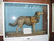 "Station Jim" (or Dog Jim), based at Slough railway station, was a Canine Collector for the Great Western Railway Widows and Orphans Fund from 1894 until his death in 1896.[18] After his death he was stuffed and placed on display in a glass cabinet with a collection slot.[19][20] Station Jim's display cabinet, which can be found on Platform 5, includes a copy of the original inscription, written after he died, that describes his life story: