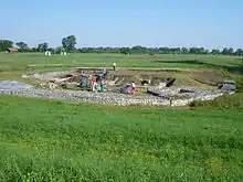 Gerulata was a Roman military camp from the second to fourth centuries. It is located near Rusovce, on the right side of the Danube to the south of Bratislava.[47] The name was probably taken from the Celtic name for the location, which seems to have been near a ford over the river. The fortified camp was established in the Flavian period, built by the X, XIV and XV Legions, and continued to be occupied and modified throughout the Roman period.[48]