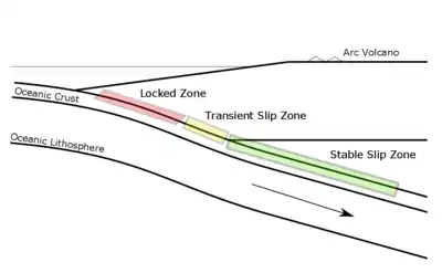 Low frequency earthquakes (LFEs) are seismic events defined by waveforms with periods far greater than those of ordinary earthquakes and abundantly occur during slow earthquakes.[8] LFEs can be volcanic, semi-volcanic, or tectonic in origin,[9] but only tectonic LFEs or LFEs generated during slow earthquakes are described here. Tectonic LFEs are characterized by generally low magnitudes (M<3) and have frequencies peaked between 1 and 3 Hz.[10] They are the largest constituent of non-volcanic tremor at subduction zones, and in some cases are the only constituent.[8] In contrast to ordinary earthquakes, tectonic LFEs occur largely during long-lived slip events at subduction interfaces (up to several weeks in some cases) called slow slip events (SSEs).[11][12] The mechanism responsible for their generation at subduction zones is thrust-sense slip along transitional segments of the plate interface.[13] LFEs are highly sensitive seismic events which can likely be triggered by tidal forces as well as propagating waves from distant earthquakes.[8] LFEs have hypocenters located down-dip from the seismogenic zone,[14] the source region of megathrust earthquakes. During SSEs, LFE foci migrate along strike at the subduction interface in concert with the primary shear slip front.[8]