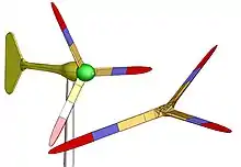A range of synthetic materials including carbon fiber reinforced polymers, nanocomposites,[4] and E-glass-polyester are available.[5] Although natural fibers are susceptible to quality variations, high moisture uptake and low thermal stability that make them undesirable for larger blades, small turbines can still take advantage of them.[6] Wood can be used, and the type of wood should be chosen based on availability, cost and growth time, average density, high stiffness, and breaking strain. Coatings are generally used to reduce moisture, and white enamel with primer has been found to be particularly effective.[7] Sitka spruce (used in propellers), and Douglas Fir have been used in turbine blades.[8] Nepal has used small blade turbines made of coated timber including Sal, Saur, Sisau, Uttish, Tuni, Okhar, pine, and lakuri wood.[9] Beyond wood, bamboo-based composites may also be used in both large and small wind turbines due to their low density and carbon sequestration ability—which makes bamboo materials environmentally friendly. Furthermore, relative to wood, bamboo has higher fracture toughness, higher strength, lower processing costs and fast growth rate. Ongoing materials developments include bamboo laminates using resins and hybrid bamboo carbon-fiber materials.[10] Hemp, flax, wood and bamboo are all candidate blade materials for small turbines.[11]