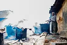 The composition of smoke depends on the nature of the burning fuel and the conditions of combustion. Fires with high availability of oxygen burn at a high temperature and with a small amount of smoke produced; the particles are mostly composed of ash, or with large temperature differences, of condensed aerosol of water. High temperature also leads to production of nitrogen oxides.[5] Sulfur content yields sulfur dioxide, or in case of incomplete combustion, hydrogen sulfide.[6] Carbon and hydrogen are almost completely oxidized to carbon dioxide and water.[7] Fires burning with lack of oxygen produce a significantly wider palette of compounds, many of them toxic.[7] Partial oxidation of carbon produces carbon monoxide, while nitrogen-containing materials can yield hydrogen cyanide, ammonia, and nitrogen oxides.[8] Hydrogen gas can be produced instead of water.[8] Contents of halogens such as chlorine (e.g. in polyvinyl chloride or brominated flame retardants) may lead to the production of hydrogen chloride, phosgene, dioxin, and chloromethane, bromomethane and other halocarbons.[8][9] Hydrogen fluoride can be formed from fluorocarbons, whether fluoropolymers subjected to fire or halocarbon fire suppression agents. Phosphorus and antimony oxides and their reaction products can be formed from some fire retardant additives, increasing smoke toxicity and corrosivity.[9] Pyrolysis of polychlorinated biphenyls (PCB), e.g. from burning older transformer oil, and to lower degree also of other chlorine-containing materials, can produce 2,3,7,8-tetrachlorodibenzodioxin, a potent carcinogen, and other polychlorinated dibenzodioxins.[9] Pyrolysis of fluoropolymers, e.g. teflon, in presence of oxygen yields carbonyl fluoride (which hydrolyzes readily to HF and CO2); other compounds may be formed as well, e.g. carbon tetrafluoride, hexafluoropropylene, and highly toxic perfluoroisobutene (PFIB).[10]