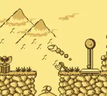 It was first published by Nintendo and released for the Nintendo Entertainment System in North America in July 1990 and in Europe on March 27, 1991.[12][13] Rare later ported the game to the Sega Mega Drive, a version which was released only in Europe by Sega in 1993; this port features an additional final level in addition to the 11 levels on the NES version.[14] In that version, the snakes make it into space, but a meteorite crashes into their spaceship, causing them to crash land on another planetoid, which serves at the 12th level.[15] After completing the level, the ending shows the snakes on a new spaceship that is going back home.[16] Although this game was never released for the Game Boy, in level 7 of the NES version, the landscape spells out "NINTENDO GAME BOY".[17] The Sega version spells "SNAKES R+R GO SEGA" in the same place.