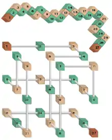 The 27-cube snake cube puzzle (Cubra Bafflin' Blue) laid flat (top) and packed into a 3×3 cube (bottom, exploded view) – cubelets with straight holes are outlined[1]
