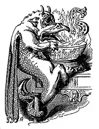 In the English play Lingua (1607) the practice is said to come from classical antiquity: "When Hercules had killed the flaming dragon of Hesperia with the apples of that orchard, he made this fiery meat; in memory whereof he named it Snapdragon."[19] Brooks' Master Sandy's Snapdragon suggests another mythical origin, relating the fire of snap-dragons to Saint George and the dragon.[9] Chambers suggests that it hearkens back to druidic fire-worship.[10] According to the Oxford English Dictionary entry for flapdragon, "the original sense may have been identical with a dialectal sense of snapdragon, viz. a figure of a dragon's head with snapping jaws, carried about by the mummers at Christmas; but of this there is no trace in our quot[ation]s".[4]