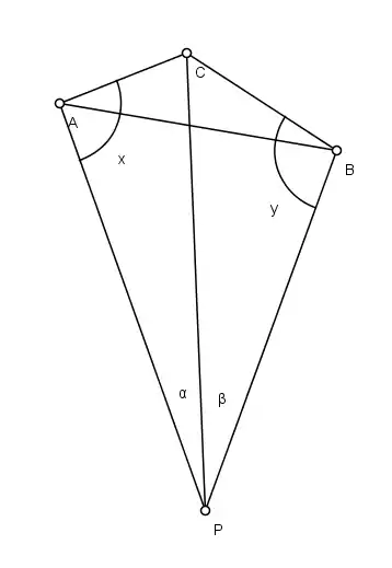 Denoting the (unknown) angles CAP as x and CBP as y we get:
