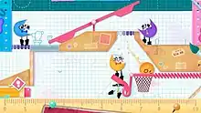 Snipperclips is a co-operative puzzle game for up to four players. In the main World mode for one or two players, players control two characters named Snip and Clip, who each possess shaped bodies that can be rotated in place. When the two characters overlap each other, one player can snip the overlapped portion out of the other player, altering the shape of their body. Using this mechanic, players must come up with creative ways to solve various puzzles, each with unique objectives, such as fitting inside a shape template, carrying objects, or cutting out a pointed end in order to pop balloons.[2] Additionally, up to four players can play the game's Party and Blitz modes. Party mode features unique puzzles designed for extra players, while Blitz mode features various competitive games, such as basketball, hockey, and snipping deathmatches.[1]