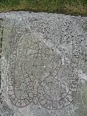 The runestone at Vreta, U 332, has disappeared. Its inscription and designs are, however, known thanks to an 18th-century drawing. This rune stone was also raised by Inga, and it adds that both her husband Ragnfastr and their children were dead, as she had inherited them. The text also states that a staff was raised in memory of Ragnfastr. Other inscriptions that indicate that a staff was raised include Sö 196 in Kolsundet, Vs 1 in Stora Ryttern, U 226 in Bällsta, and the now-lost U 849 in Balingsta.[5] On three other inscriptions, DR 40 in Randbøl, Sm 16 in Nöbbele, and Sö 56 in Fyrby, the word "staff" may refer to the staves of the runes in the text.[5] The Hillersjö stone (U 29) ends the family saga by telling that Inga had died without living children and that the property had passed to her mother Gerlög on the island of Färingsö.