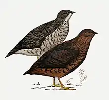 The Snow Mountain quail (Synoicus monorthonyx), is a large, approximately 28 cm (11 in) long, dark brown quail of alpine grasslands. It was formerly considered the only member of the genus Anurophasis, but phylogenetic analysis places it as the sister species to the brown quail (S. ypsilophorus) in the genus Synoicus.[2] It has a brown plumage, a horn-coloured bill, yellow legs and a brown iris. The underparts of the female are whitish and more heavily black barred than in the male.