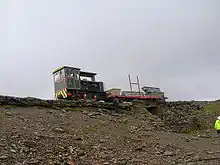 In 2006 the Snowdon summit cafe was demolished and construction of a new visitor centre was started. While this construction was taking place passenger trains terminated at Clogwyn, but the line and a works train was still used to transport workers and materials to the project. On some days, however, the train could not reach the summit and the workers had to walk down to Rocky Valley.[22] The new building, Hafod Eryri (loosely translated from Welsh as "high summer residence of Snowdonia"),[23] was officially opened by First Minister Rhodri Morgan on 12 June 2009.[22]
