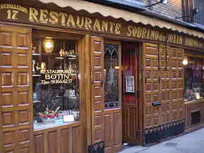 Sobrino de Botín is a Spanish restaurant in Madrid, founded in 1725,[1] that is the oldest restaurant in the world in continuous operation.[2] The artist Francisco de Goya worked in Cafe Botín as a waiter while waiting to get accepted into the Royal Academy of Fine Arts. The restaurant is mentioned in an Ernest Hemingway novel and the book Fortunata y Jacinta by Benito Pérez Galdós (published 1886–1887).