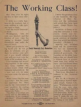 1900 leaflet of the Peekskill SDP which used an arm-and-torch logo reminiscent of the arm-and-hammer used by the Socialist Labor Party of America
