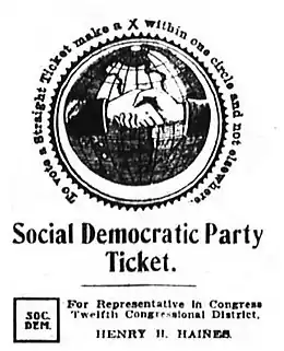 June 11, 1898 marked the conclusion of the convention of the Social Democracy of America as well as the day that 33 delegates bolted to hold a meeting establishing themselves as the Social Democratic Party of America.[5][6]
