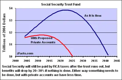 - February 2005 – Republican President George W. Bush outlined a major initiative to reform Social Security which included partial privatization of the system, personal Social Security accounts, and options to permit Americans to divert a portion of their Social Security tax (FICA) into secured investments. In his 2005 State of the Union Address, Bush discussed the potential bankruptcy of the program. Democrats opposed the proposal.[47] Bush campaigned for the initiative in a 60-day national tour.[48] However, public support for the proposal only declined.[49] The House Republican leadership tabled Social Security reform for the remainder of the session.[50] In the 2006 midterm elections, Democrats gained control of both houses, effectively killing the plan for the remainder of Bush's term in office.