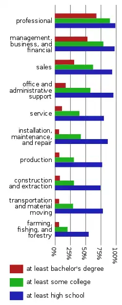In 2005, the vast majority of those with doctorate and professional degrees were among the nation's top 15% of income earners.[17] Those with bachelor's degrees had incomes considerably above the national median while the median income for those with some college education remained near the national median. According to United States Census Bureau, 9% of persons aged 25 or older had a graduate degree, 27.9% had a bachelor's degree or more with 53% having attended college.[17][18]
